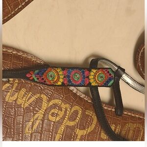 Colorful embroidery with metallic accents. Gigi leather multi color embroidery black T Strap thong. Sharp looking sandal! Very comfortable. Only worn a couple of times.