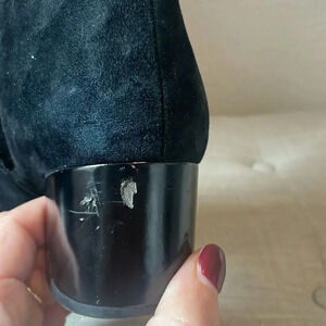 Preowned nice condition black suede Sam Edelman size 8 heeled booties. Zippers on side. A few scrapes/chips on the heel. See images for reference. Otherwise clean and nice quality.