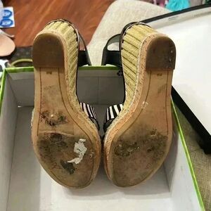 In great condition, worn once. No wear or tear. Comfortable and trendy, black cream, cork and braided detail on wedge. Medium to Narrow width. True to size.