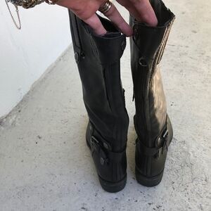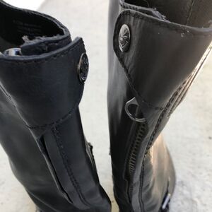 These black tall boots are in good condition. They have a side zipper and a zipper at the top it comes down about 4 inches. The width of the top laying flat is approximately 7 1/2 which means circumference is 15 approximately length of the shaft is approximately 15 1/2.
