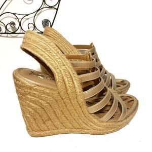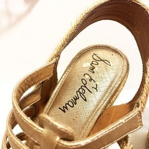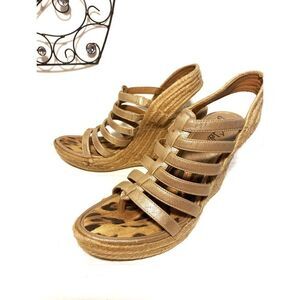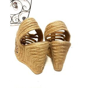 Gold strap upper with an espadrille back strap that blends with the espadrille heels. Cheetah print insole with rubber outer sole. Light signs of wear on back of both heels, inside part of shoe and with a couple small wear spots at toe that are barely noticeable.. inside part of shoe looks like could have gotten cut on something