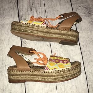 Sam Edelman Neera Espadrille Wedge. Good, preloved condition. Shades of brown, orange, pink, yellow, and blue. Beaded flatform espadrille sandal with braided ankle tie. Braided laces. Material: Leather with beading, Insole: Synthetic. Boho. Bohemian. 2 inch platform.