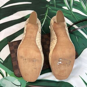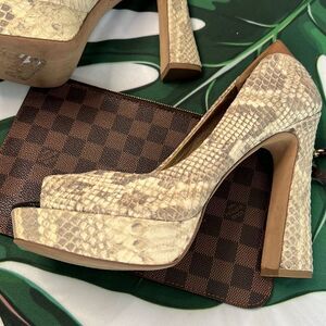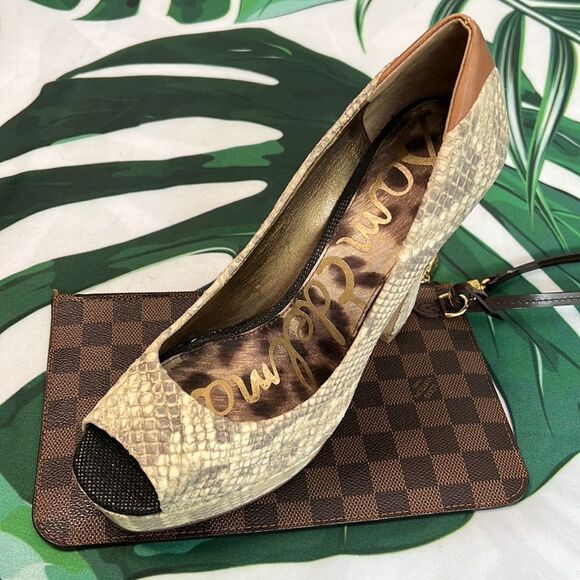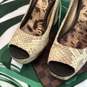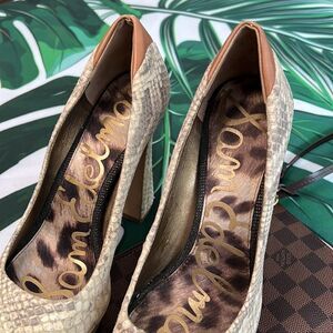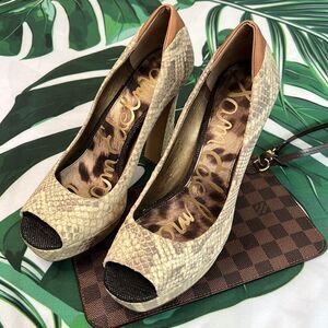 Sam Edelman cream and gray snake print leather pumps with peep toe excellent condition no damage features a heel height of 4 1/2 inches
