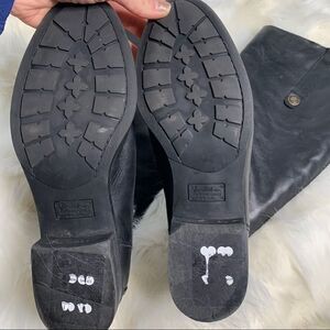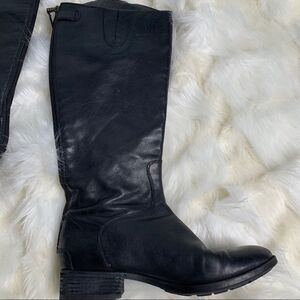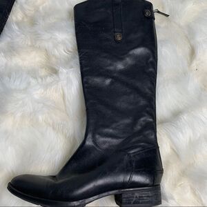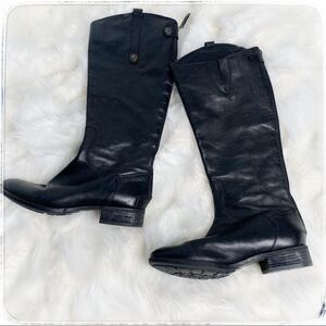 Great wardrobe staple, black penny boots by Sam Edelman. Features knee high length with slanted shaft. Back zip with snap tab closure. Leather upper with synthetic lining and sole. These have never been worn but show some general scuffs from being in store environment. Also missing one zip tab as shown. Can be easily replaced. Still available online