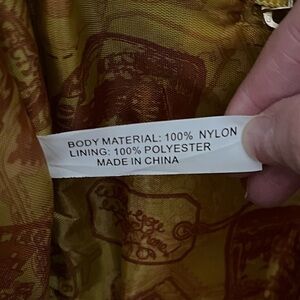 Features Polyester Gold Designed Fabric on interior lining. Bag has a black nylon body with brown leather pull and gold hardware. Bag has one exterior zipper pocket and will fit over your pull luggage. The interior has one zipper pocket and two open pockets. Side snaps keep the triangle shape or can be unsnapped to widen the bag.