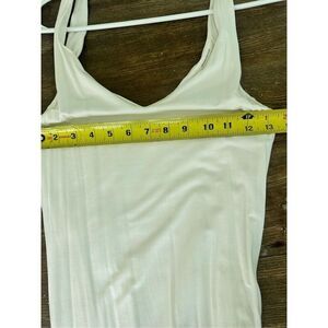 Samantha Eng white bodycon asymmetrical dress, size small. The dress is ruched and comes up on that side with the other side being longer. It is a perfect dress for the summer! It has a two makeup marks on the inside of the dress, which you should be able to get out.