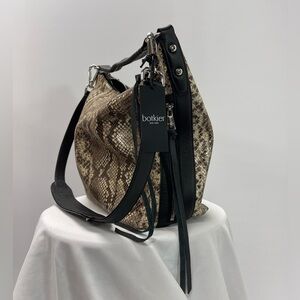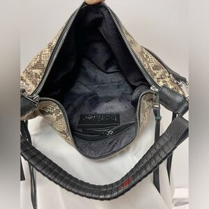 New with tags bag. Color is Teak snake. Has thick chords strap across the top. Only flaw is a red paint mark on the inner handle. Otherwise flawless. Has shoulder strap that can be removed with a clip. Hobo style slouchy bag with full zipping closure. Zipper pocket on the inside. Aside from the red spot, perfect condition. Comes with $298 tags.