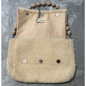This cozy and whimsical Samantha Pleet purse features a plush cream sherpa exterior and a unique wooden beaded top handle, giving it a playful yet elegant look. The structured flap design secures with three magnetic snap closures and opens to a smooth satin-lined interior. Perfect as a statement piece for fall and winter outfits.