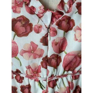 This dress by Samantha Sipos is in excellent condition. It is in ivory and red colors in an allover floral print. Ruffled frills highlight the plunging neckline of this light-as-air dress that's both sassy and sweet. The dress features; fit and flare silhouette, midi length, fully lined, v-neckline and v-back, tie across chest, sleeveless with wide straps, ruffled detail and a back zipper closure. Made from 100% polyester.