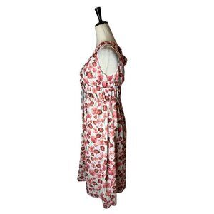 This dress by Samantha Sipos is in excellent condition. It is in ivory and red colors in an allover floral print. Ruffled frills highlight the plunging neckline of this light-as-air dress that's both sassy and sweet. The dress features; fit and flare silhouette, midi length, fully lined, v-neckline and v-back, tie across chest, sleeveless with wide straps, ruffled detail and a back zipper closure. Made from 100% polyester.