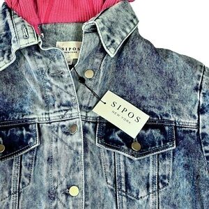 Oversized vintage 80’s look. New w/ tags Samantha Sipos NY zinna denim jacket. Blue denim with hot pink knit hood & underlay. Hidden front zipper with button closure. Front and side pockets.