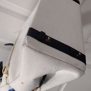 Discover the elegance of the Samantha Thavasa Deluxe Shoulder Bag in white canvas with black leather handles. This versatile 2-way tote handbag features gold hardware, a zipper and magnetic closure, and three compartments with slip pockets and a zip pocket. Despite some stain marks, it remains in good condition, offering style and functionality.