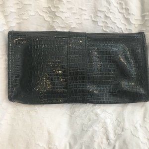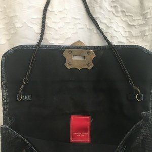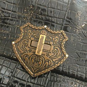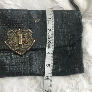 Embossed Patent leather with brass colored metal hardware and removeable chain strap.