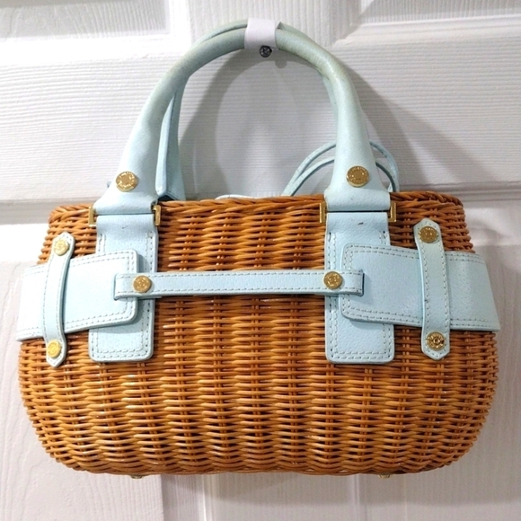 Samantha Thavasa Yellow Straw and Blue Leather Rattan Bag, Drawstring Handbag