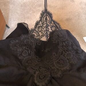 Samantha Treacy black silk halter dress lace front side zip lined wavy hemline 4