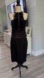 Samantha Treacy little black dress has a feather ruffled front, ruching in middle, and cross straps affixeded with buttons in back.
