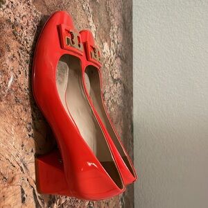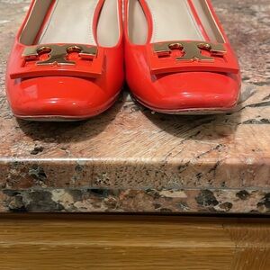 Samba Tory Burch Gigi Pumps Size 8. The condition is good to fair. The patent leather is in relatively good condition. It has minor scuffs and scratches. The insoles are a little soiled, and on the bottoms of the shoes, as you can see from the photos, the rubber has come off. maybe a no-slip patch can fix the shoe, but I don’t know. overall the shoe looks good, but the bottom of the shoes has some deterioration. Also these shoes are a size 8, but they run a bit large. I think I can never win with Tory Burch shoes. The eights are usually too large and the 7 1/2 are too small so I would recommend that if you are between 7 1/2 and eight, these might be too big for you if you are between an eight and 8 1/2 they would probably fit more comfortably. It’s the size issue that I am parting with these not that I don’t like them.
