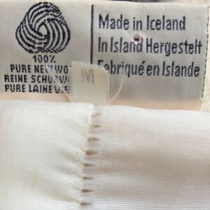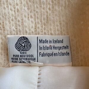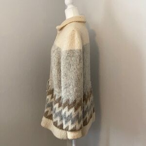 Size medium Samband of Iceland wool jacket. Cream, gray & brown. Drawstring to cinch in the waistline. Nordic style. Pockets. Cozy & warm!