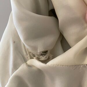 Flaws in photos - lining in the underarm area of one sleeve is ripped (see photo); small hole in collar - on the back (see photo) & small spot on cuff (see photo)
