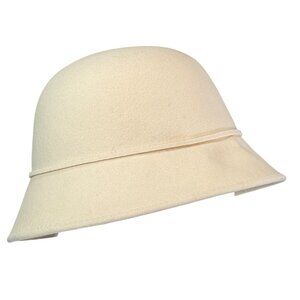 Crafted with delicate artistry, this classic cloche hat features a soft beige hue and an intricate flower accent. Made from 100% wool, it evokes an air of vintage charm and elegance, perfect for timeless, graceful looks.