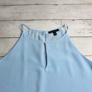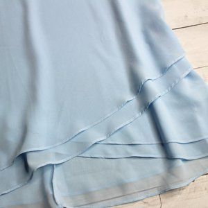 This light blue blouse has a rounded neckline with keyhole front with multiple layers of sheer chiffon fabric. The front has four layers of fabric and is not see through. The back has two layers of fabric and is slightly sheer. The shoulders have thin spaghetti straps, and the back has a button fastener with keyhole opening. It's an absolutely beautiful blouse and is brand new with tags.