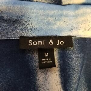 Excellent used condition, no hole, tears or snags. Sami & Jo cold shoulder button up blouse. Shades of blue watercolor brush stroke pattern, silver color buttons, 2 button cuffs, semi sheer, hi/low hem.