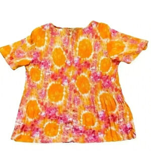 Fuchsia and Orange Tie Dye Print, accordion style pleated at top, very flattering relaxed fit ,short flutter sleeve