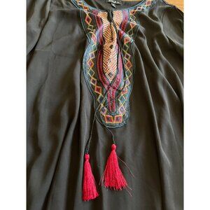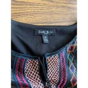 Sami & Jo black embroidered front long open sleeved dress size 2X. Each sleeve is slit open all the way down. Red blue purple embroidered front with ties that have red tassels. Dress is lined. Hand wash, line dry. Great pre-owned condition.