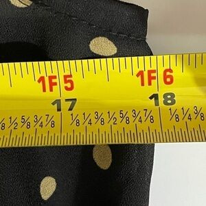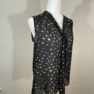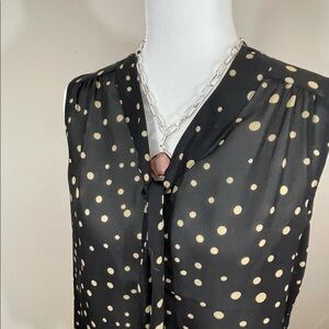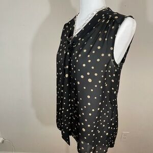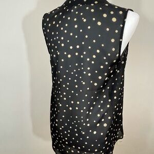 Pretty summer button down top in black with cream dots. The neck has a standup band around the neck. The band comes around to the front and has a tie that can just have a simple tie or snow or it can just hang. The fabric is lightweight and a camisole would be a suggestion. Pretty casual or dressy. No visible flaws. Any questions please ask. Will answer questions as soon as possible. R 1