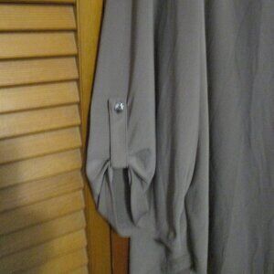 Sami & Jo brand - Top is tan/light brownish in color. The neckline has decorative gathers of material and a string of pearl-like beads, and notice gathers on back neckline. Sleeves are 3/4 length, and they button up. Feminine and stretchy. Please check measurements for best fit. Like new condition.