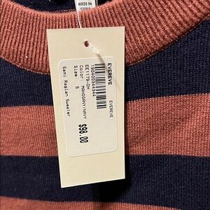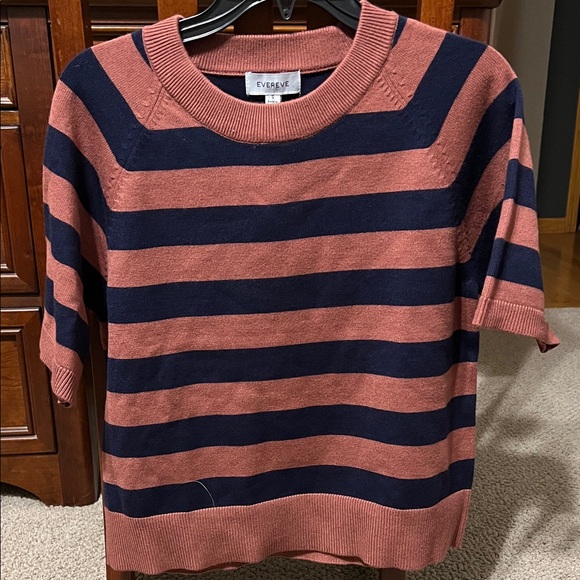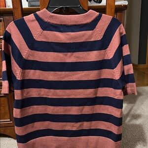 and navy stripes. Features short sleeves and a classic crew neck.