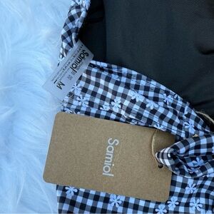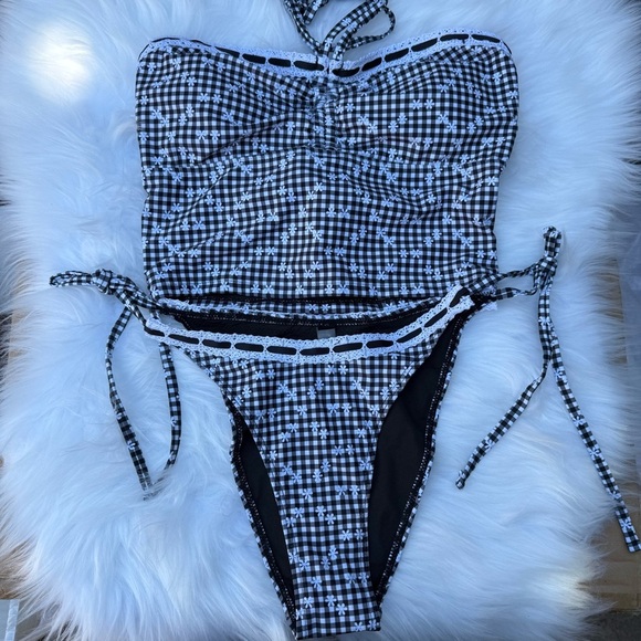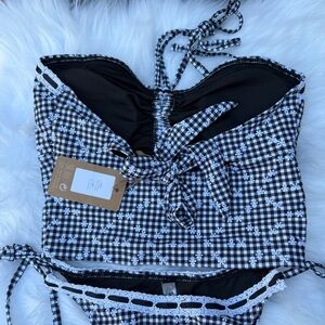 Chic Soma bikini bottom with black and white gingham pattern. Features delicate floral accents and lace trim.
