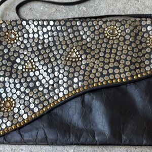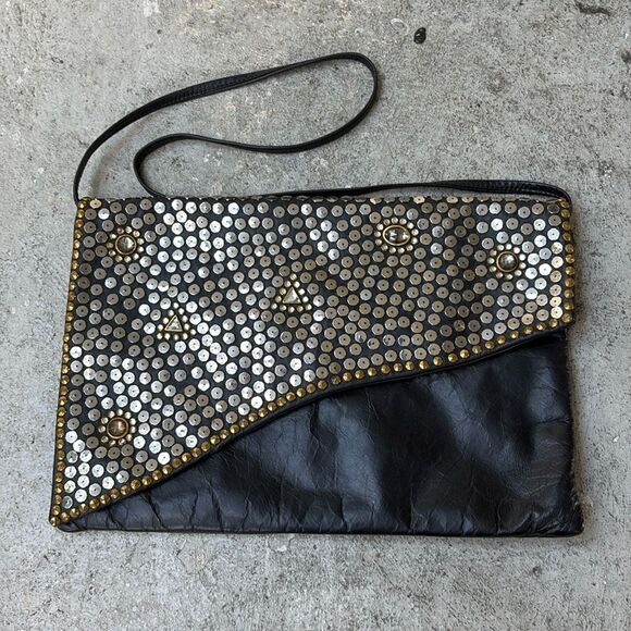I believe this to be Sameer, but the label is no longer visible inside. Use it as a clutch or a shoulder bag. Measuring across the front is 13 x 5 x 9.5 with a handle drop of 13.5.