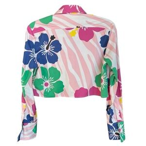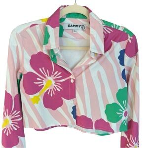 Sammy B Tropical Floral Crop Button Front Top Pink Multi Small Beach Vacation