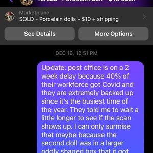 Here are screen shots of boxes that I shipped on Dec 7. I dropped them at the box drop at the post office (very long line) so I didn’t get a receipt. It might appear they hadn’t shipped as a result because they didn’t start tracking until Dec 21.