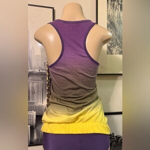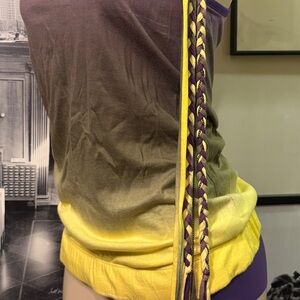 Flattering racerback tank top in a beautiful gradient of purple and yellow knit fabric with a matching single light chain and fabric rope braids. Go Lakers..!