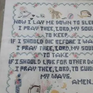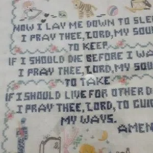 Framed VTG handstiched needlepoint sampler of Child's Bedtime Prayer