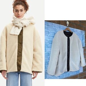 Naya 14469 Angora polyester jacket, • Casual fit, • Faux sheepskin, • Low shoulders, • Crew neck, • Contrast button placket, • Padded with textured