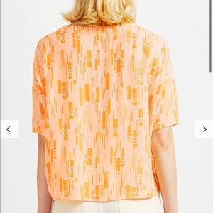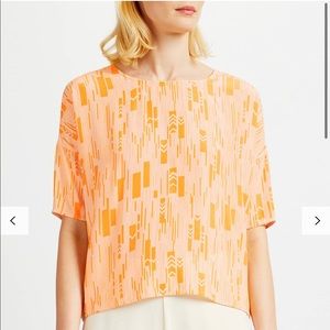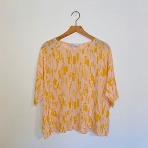 Excellent used condition women’s size large feminine printed blouse shirt in pink and yellow. Style is “Mains”. Scandinavian higher end brand. Comes from a smoke free clean home. Lightweight with a boxy fit shape. Elbow length sleeves and wide round neckline. There is a small discoloration that I pointed out in pictures but it is very light and blends in.