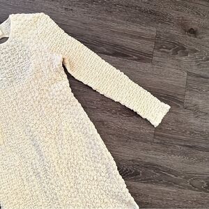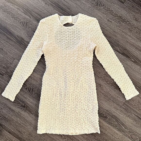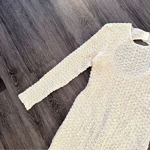 'Bianca' mini dress from Samsoe Samsoe. Made of textured recycled fabric with a crinkle effect, this fitted design features lurex threads, buttons and cut-out at the back, round neck and long sleeves.