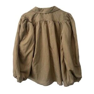Loose fitting shirt with deep armhole and long puffed sleeves. Narrow shoulder with gathering details, gathered back neck yoke seam, elasticated cuffs. Tencel and linen blend fabric.