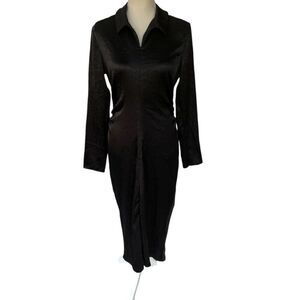Samsoe Samsoe Ivana Black Crepe Textured Long-Sleeve Collared Midi Dress Size L