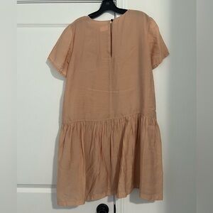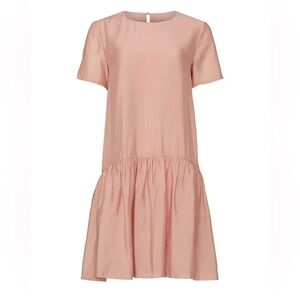 Pink crepe (86% Rayon, 14% Polyester). Shift. Short sleeves. Crew neckline. Back button at neck. Fully lined.