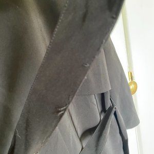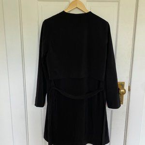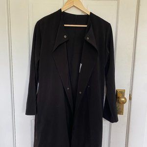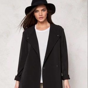 This lightweight, long jacket by Danish Designer Brand Samsoe Samsoe has a modern take on a trench coat. It has clean bound edges inside, and metal press buttons which puncuate this jacket. Invisible zip fastening pockets are inserted in this side seams.