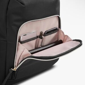The exterior front pocket has two slip pockets and a pen sleeve. Backpack also includes a strap on the back so you can strap it on upright luggage handles for easy mobility during travel! Backpack dimensions included in photos.