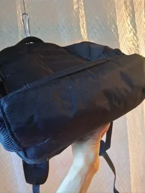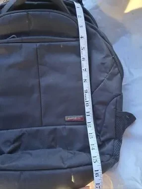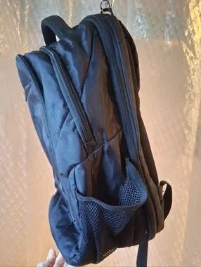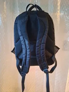 Durable black backpack designed for everyday travel and work. Multiple compartments and front pocket for easy organization. Comfortable padded handle and straps for all-day carry. Sturdy construction in black fabric for versatile use.