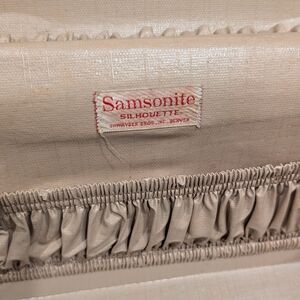 Samsonite train case interior with gathered elastic pocket. Cream textured lining and sewn brand label. Neat compartment for organized storage.