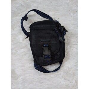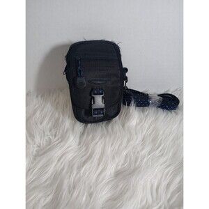 This is a Samsonite small black padded camera bag case with a strap and several compartments. It is made of nylon material and features accessory compartments and an adjustable strap. Perfect for keeping your camera and accessories organized and protected while on the go.