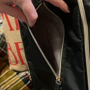 Black nylon backpack with gold accents. Front zipper pocket keeps your travel essentials at your fingertips and the internal organization keeps everything in its place. The suitcase strap on the back makes getting through the airport a breeze. 16” high, 12” across.