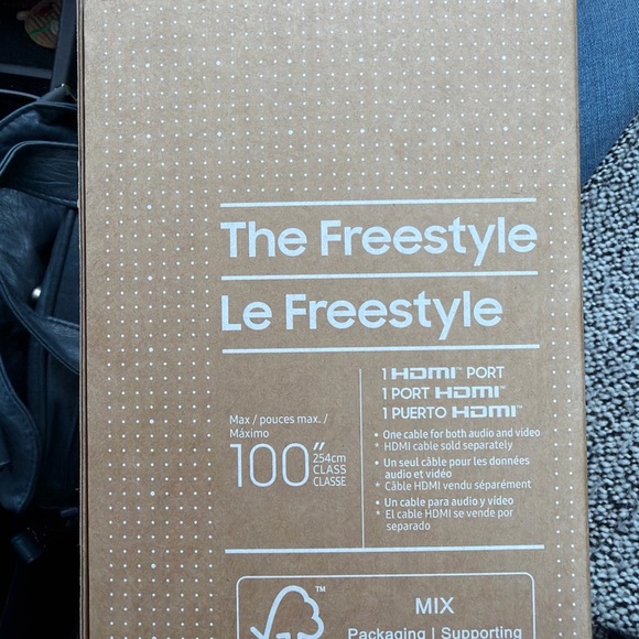 Samsung Freestyle projector box with detailed labeling. Compact design for easy transport. New in box never opened. We don’t need it. Would be great for family get togethers and parties.
